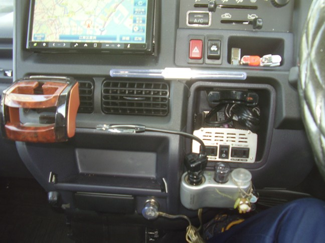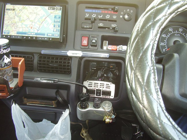 3連ソケットの上はコンバーター(定格130W/30分150W)とETC本体です。